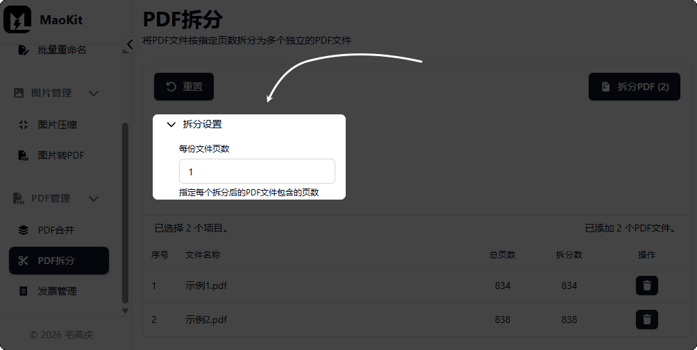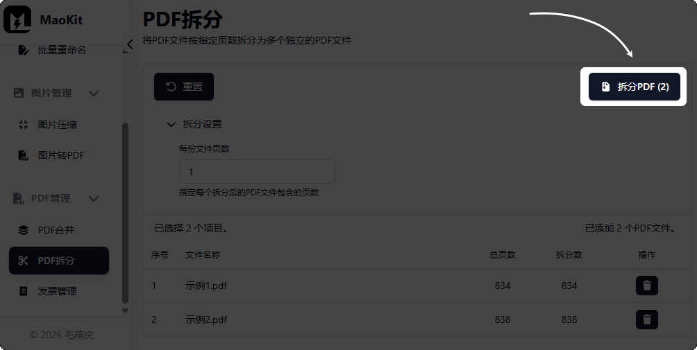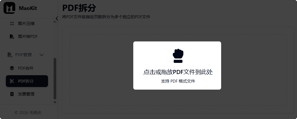 【MaoKit】PDF拆分:将多个PDF按照自定义页数拆分 2026-1-24 15:28 | 106 | 0 | Maosoft/MaoKit 163 字 | 1 分钟内 1. 官网入口 点击查看 2. 功能简介 支持将多个PDF文件按照指定页数拆分。 3. 操作步骤 3.1. 第1步:拖放文件夹 说明本工具在拆分PDF时,会动态调用毛燕庆开发的智能解析算法,并完全在本地运行,不会将文件上传至云端。 3.2. 第2步:拆分设置 指定每个拆分后的PDF文件包含的页数。 3.3. 第3步:拆分PDF 等待片刻,即可完成。 赞赏
