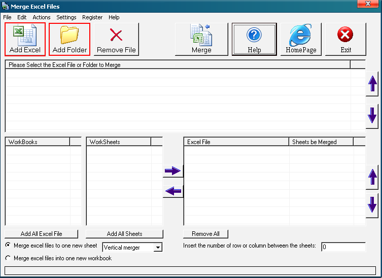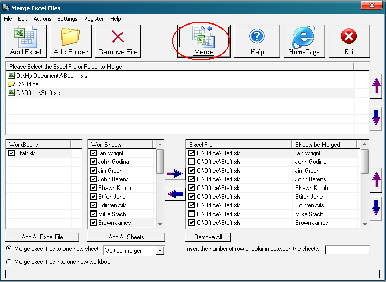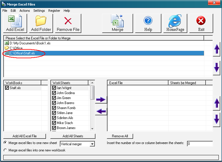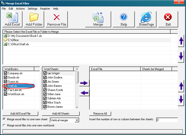 (1)可以通过单击Add all Excel Files按钮,将所有在“WorkBooks”列表中的Excel 文件,一键批量添加到“Sheets be Merged”列表中;