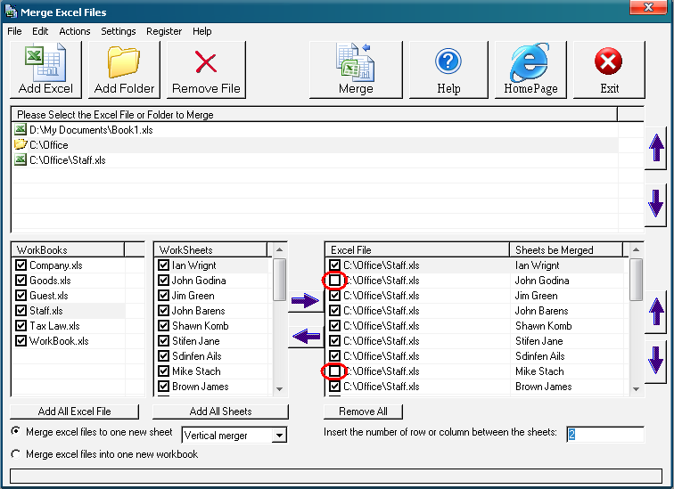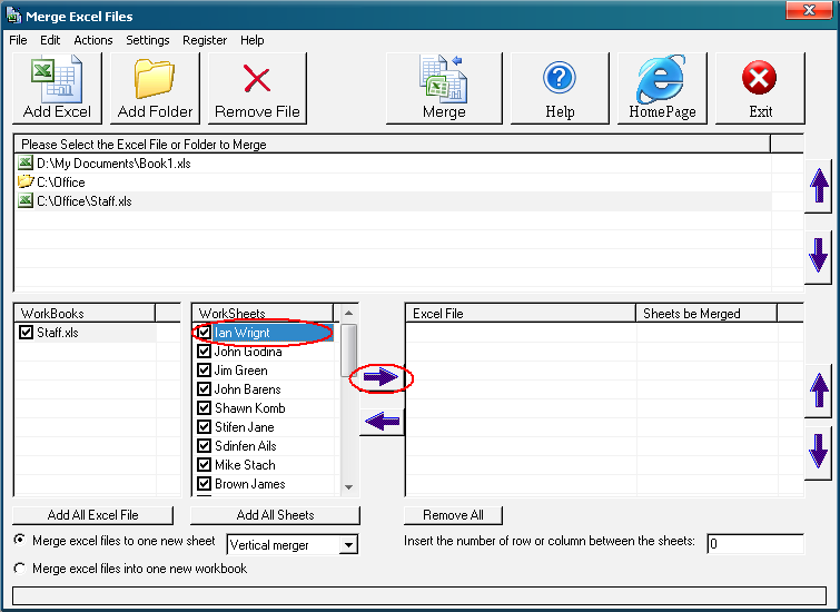 在“WorkSheets”列表中选择一个工作表,双击或单击 ➡️(向右箭头)按钮并添加到“Sheets be Merged”列表中。