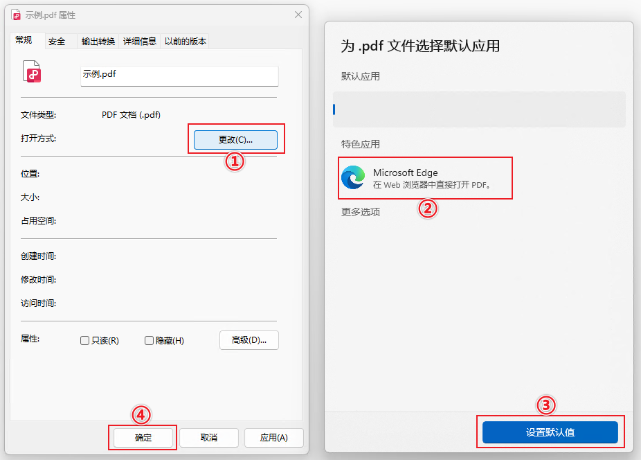 在任意一个pdf文档上,单击右键 → 属性 → 更改 → Microsoft Edge → 设置默认值 → 确定。