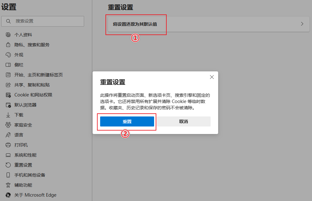 【Microsoft Edge】重置设置 2025-10-20 11:11 | 1,402 | 0 | Windows 52 字 | 几秒读完 1. 打开设置界面 复制以下字符串 → 粘贴至 Edge 浏览器地址栏 → 回车。 edge://settings/reset 2. 重置设置 将设置还原为默认值 → 重置 。 赞赏