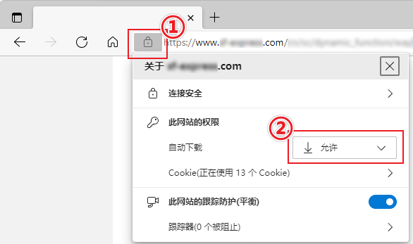 点击浏览器地址栏左侧的 锁状按钮 → 此网站的权限 → 自动下载处,下拉选择 允许。