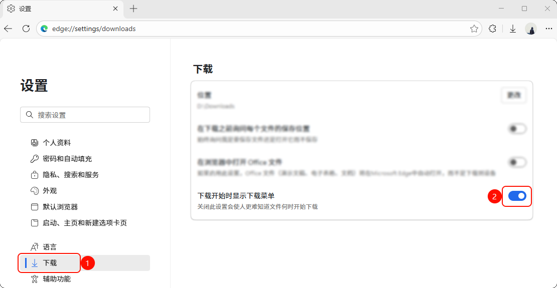 - 若开启它,Microsoft Edge 浏览器(以下简称Edge)会在每次下载前弹出下载提示窗口,询问用户拟保存的位置。