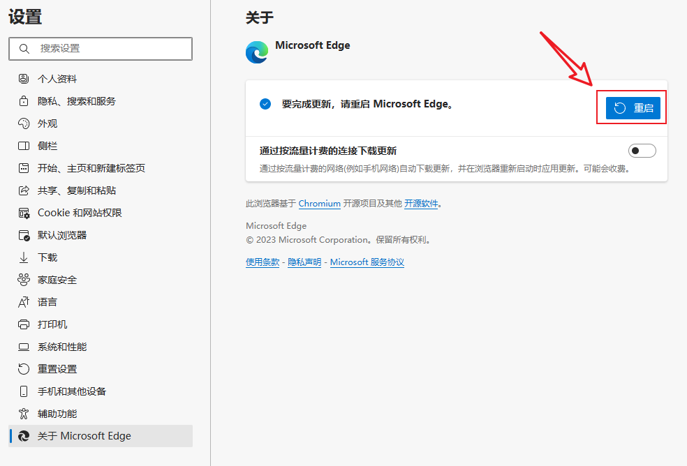 等待Edge浏览器更新完成后,按照网页提示,重启一下Edge浏览器。