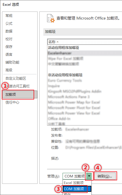 文件 → 选项 → 加载项 → 下拉选择COM加载项 → 转到(G)...。