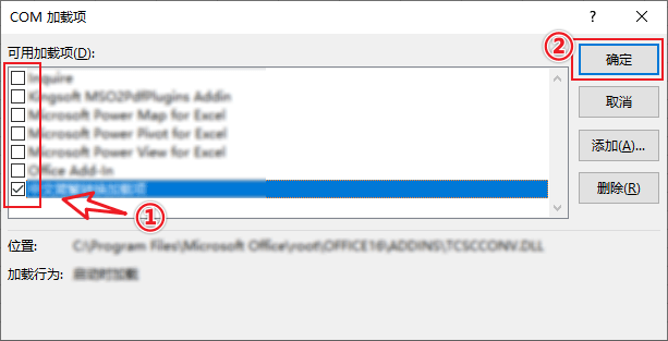 操作步骤(2/2):添加好后,确认相关加载项已被勾选上 ,然后点击确定即可。