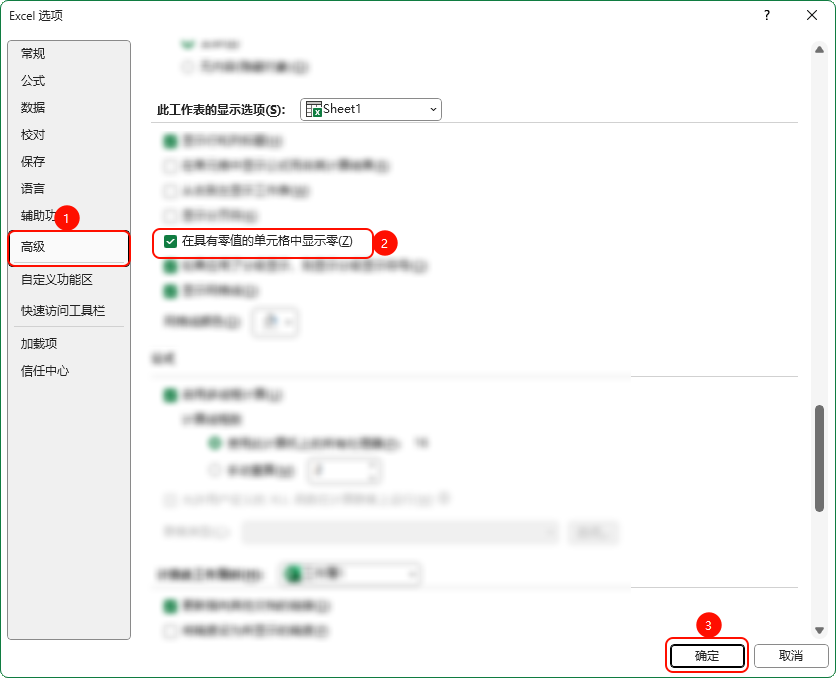 【Excel】在具有零值的单元格中显示零 2025-4-15 7:30 | 968 | 0 | Microsoft Excel 65 字 | 几秒读完 1. 说明 “在具有零值的单元格中显示零” 选项功能说明: 勾选:显示零; 取消勾选:不显示零,显示为空白。 2. 操作步骤 Excel → 文件 → 选项 → 高级 → 勾选或取消勾选“在具有零值的单元格中显示零” → 确定。 3. 图示 赞赏