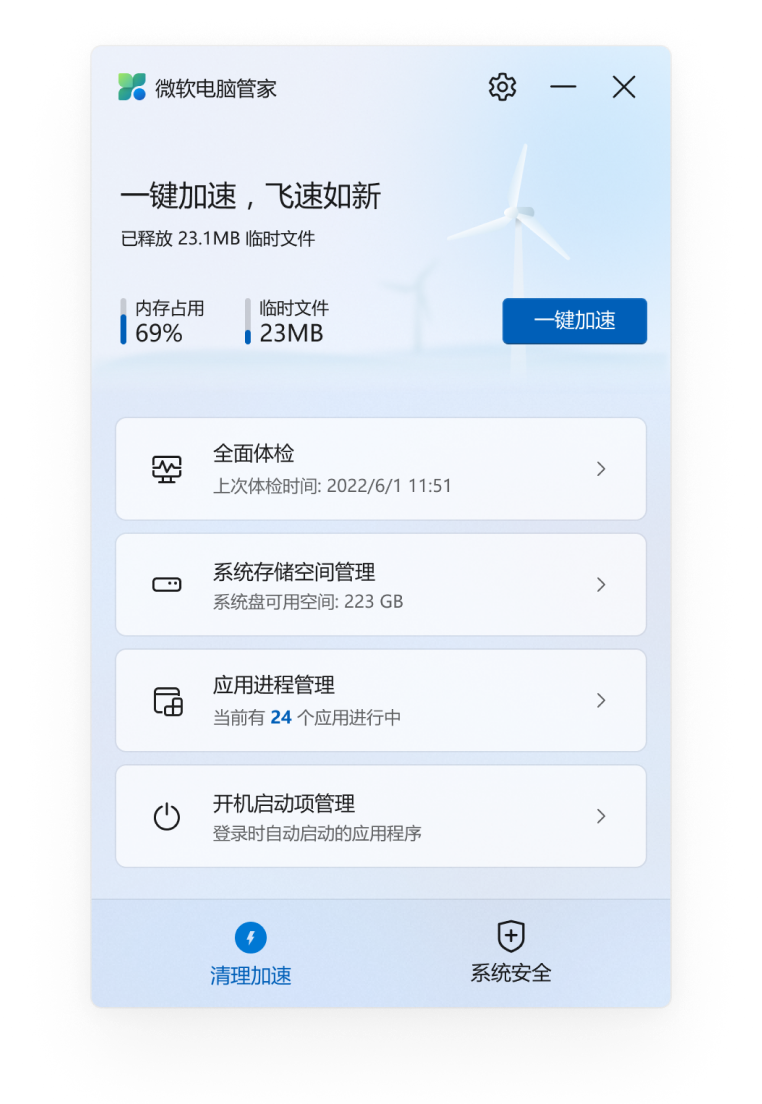 微软电脑管家是由微软官方自研的一款个人电脑安全管家类软件,功能包括: