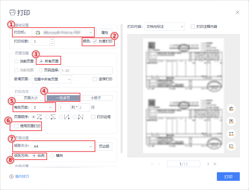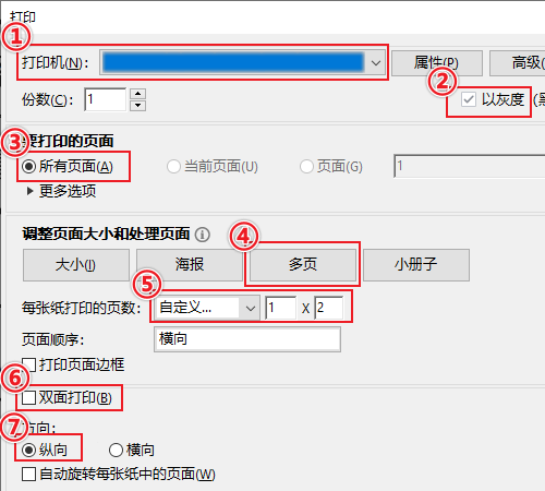 1×2 - ⑥ 双面打印:不勾选(默认)
