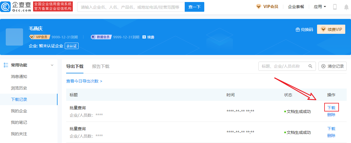企查查,不同类型会员可批量导出的数据类型不同,差异如下: