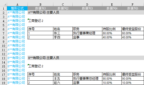 | 股东信息 | =TRIM(IFERROR(IF(COUNT(FIND({"股东信息-最新公示"},B4))>0,B2&"",A1&""),A1&"")) |