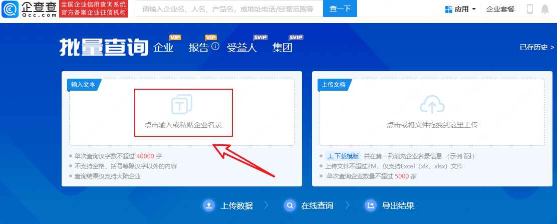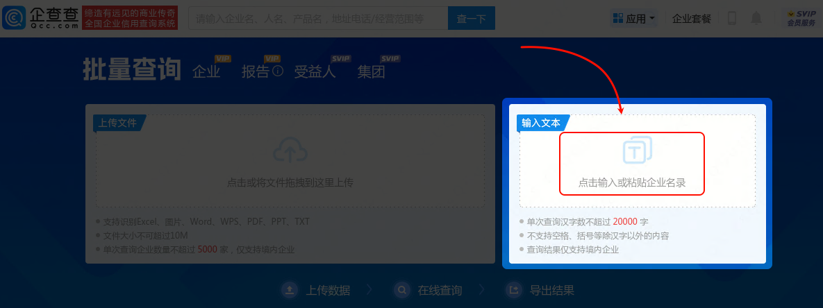 复制拟批量查询的企业清单,点击【输入文本】框,粘贴(快捷键:Ctrl + V)。