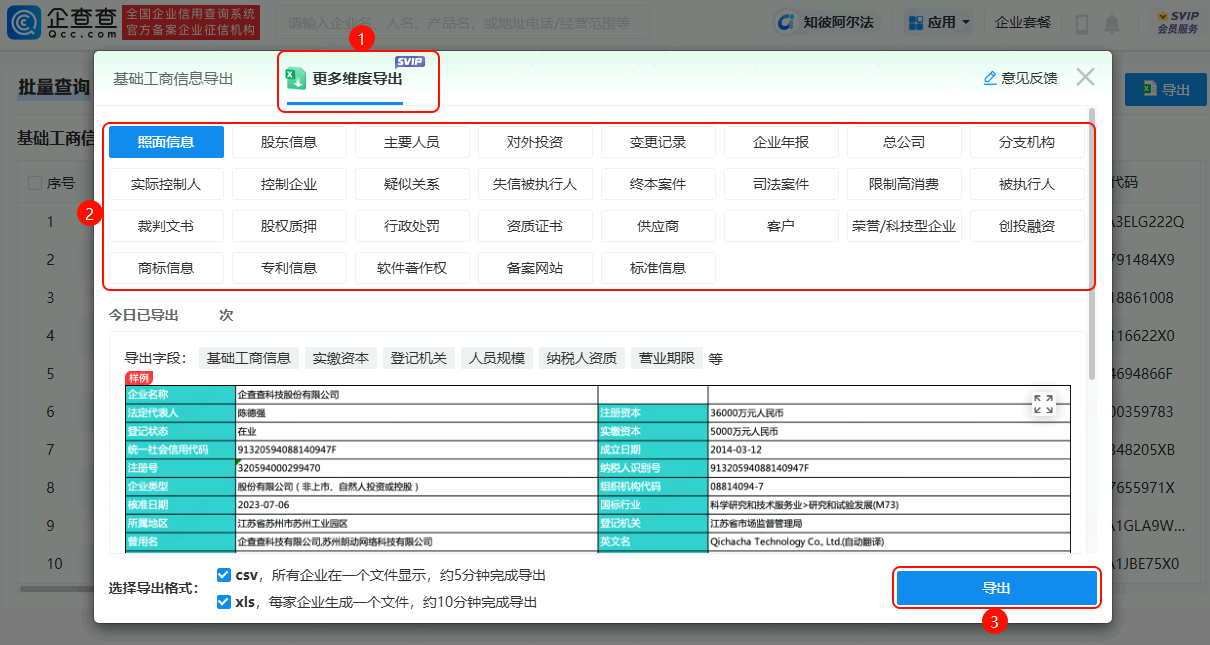 | 2 | 更多维度导出 | SVIP | 照面信息、股东信息、主要人员、对外投资、变更记录、企业年报、总公司、分支机构、实际控制人、控制企业、疑似关系、失信被执行人、终本案件、司法案件、限制高消费、被执行人、裁判文书、股权质押、行政处罚、资质证书、供应商、客户、荣誉/科技型企业、创投融资、商标信息、专利信息、软件著作权、备案网站、标准信息 |