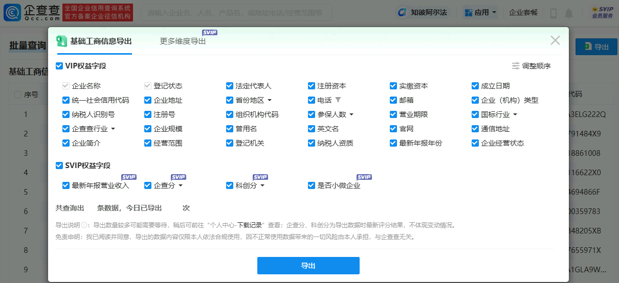 (2)基础工商信息导出 → 全选“VIP权益字段”、全选“SVIP权益字段” → 导出