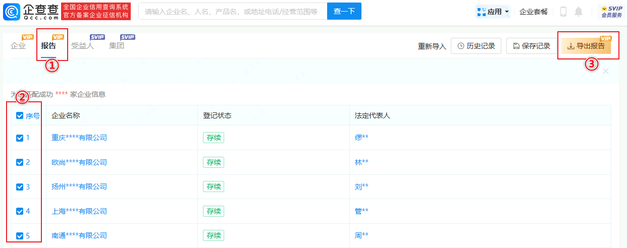 报告 → 全选需要导出的企业 → 导出报告 → ……