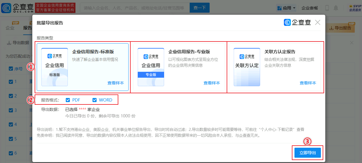 企查查,VIP用户每日可导出20份企业报告,企业套餐成员/SVIP用户每日可导出1000份企业报告;暂不支持港台企业、美股企业、政府单位报告导出,导出时将自动过滤。