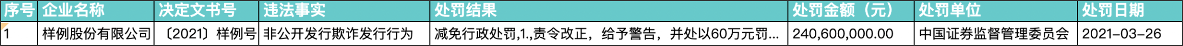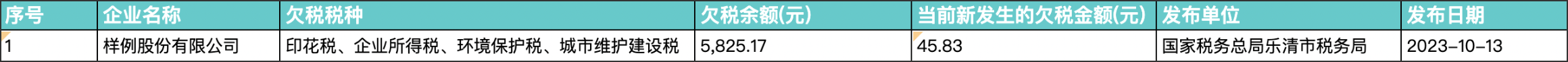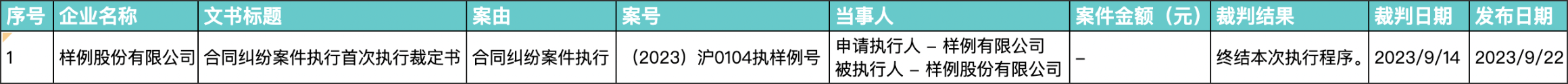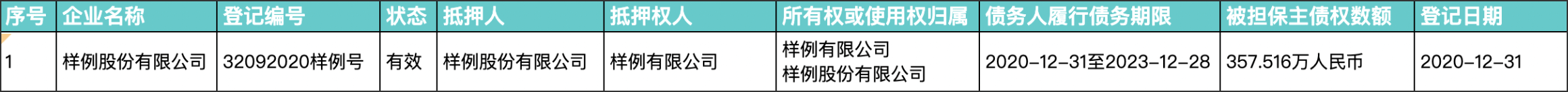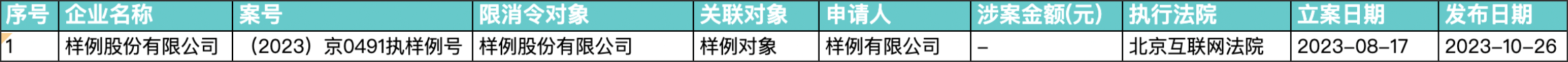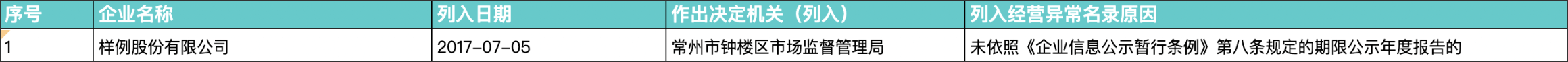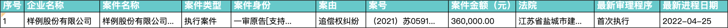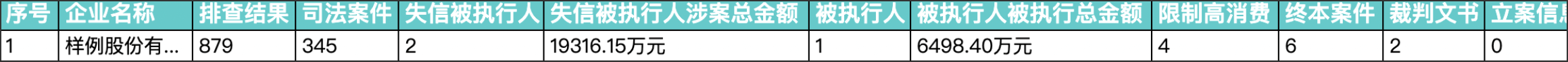 排查结果、司法案件、失信被执行人、失信被执行人涉案总金额(万元)、被执行人、被执行人被执行总金额(万元)、限制高消费、终本案件、裁判文书、立案信息、开庭公告、破产重整、股权冻结、限制出境、行政处罚、经营异常、严重违法、环保处罚、税务非正常户、欠税公告、税收违法、惩戒名单、不良行为、股权出质、股权质押、动产抵押、土地抵押、简易注销、注销备案、公示催告等。