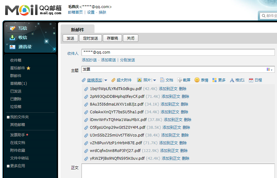 - 添加附件:将“电子发票”以文件的形式发送,不要以压缩包的形式发送。