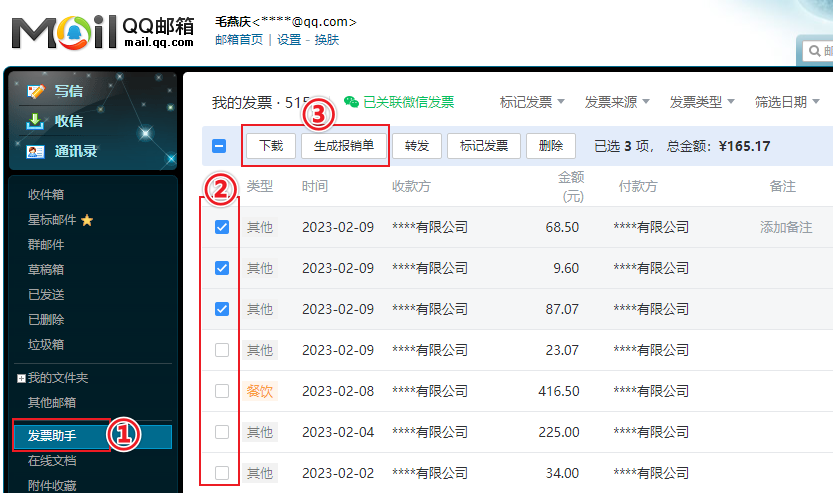 QQ邮箱 → 发票助手 → (按需勾选) → 下载 / 生成报销单 。