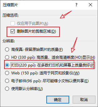 (2)勾选删除图片的裁剪区域 → 选择打印(220 ppi)... → 确定