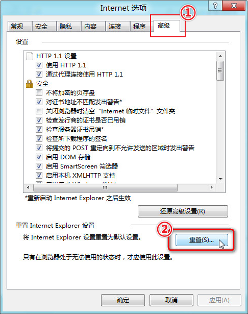 (1)高级 → 重置(S)... 。