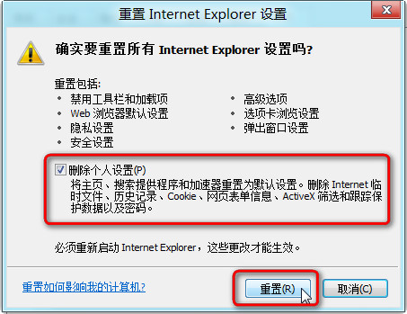 (2)在对话框“确实要重置所有 Internet Explorer 设置吗?”中,点击 重置(R) 按钮。