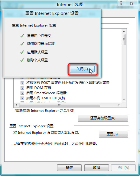 在 Internet Explorer 完成默认设置的应用之后,依次点击 关闭(C) 和 确定 按钮。