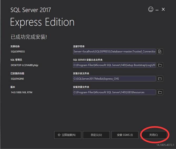 到此,SQL Server 2017 Express 已经安装完毕。