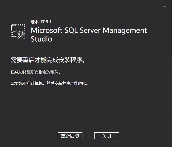 至此,SSMS 安装完毕,重启电脑,自动完成最后的处理。