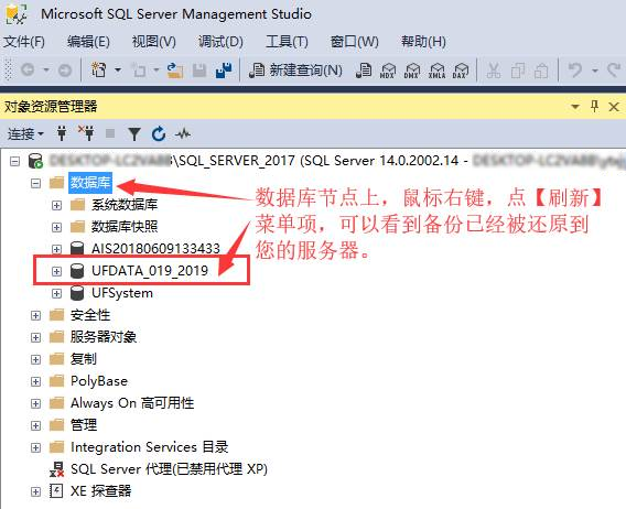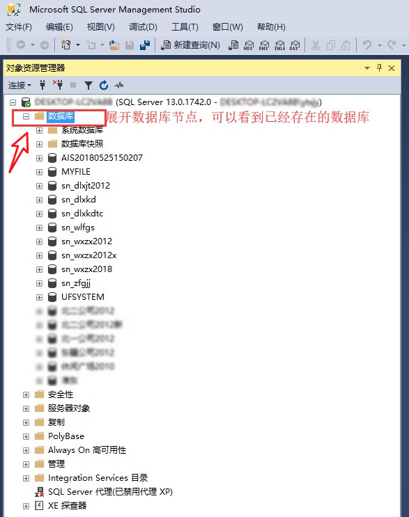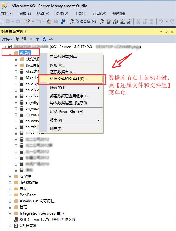 若被审计单位的财务软件数据库类型是 Microsoft SQL Server 数据库,可以安装 Microsoft SQL Server 数据库系统及其配套的数据库管理工具(SSMS),还原被审计单位提供的数据库备份文件到您的 Microsoft SQL Server 数据库系统。
