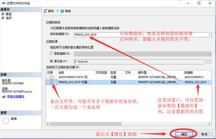 (12)勾选拟还原的备份集(一次只能勾选一个) → 修改「目标数据库」名称,与拟还原备份的数据库名称保持一致 → 确定