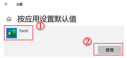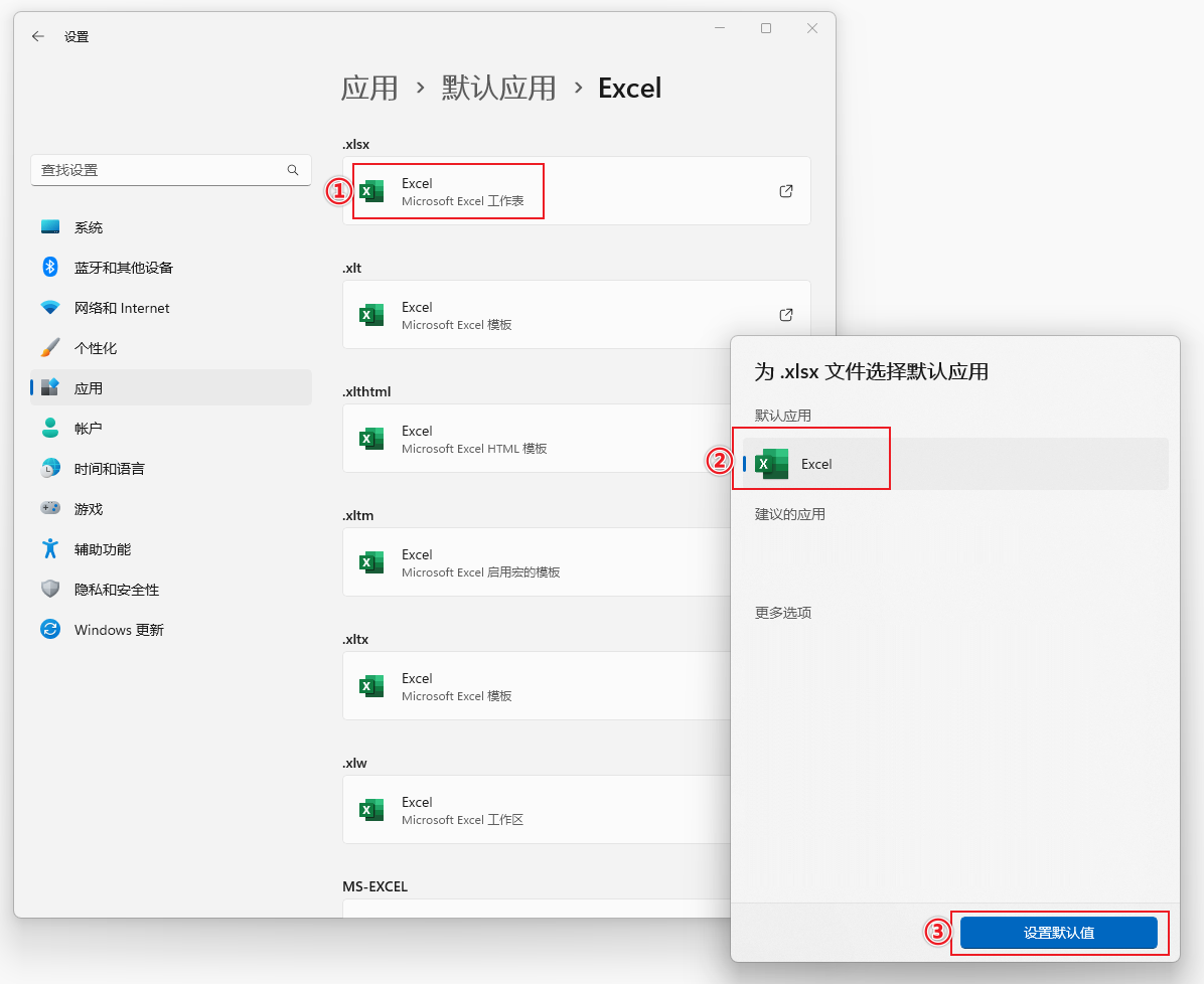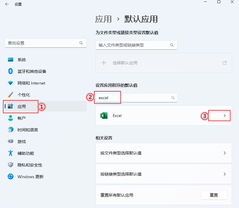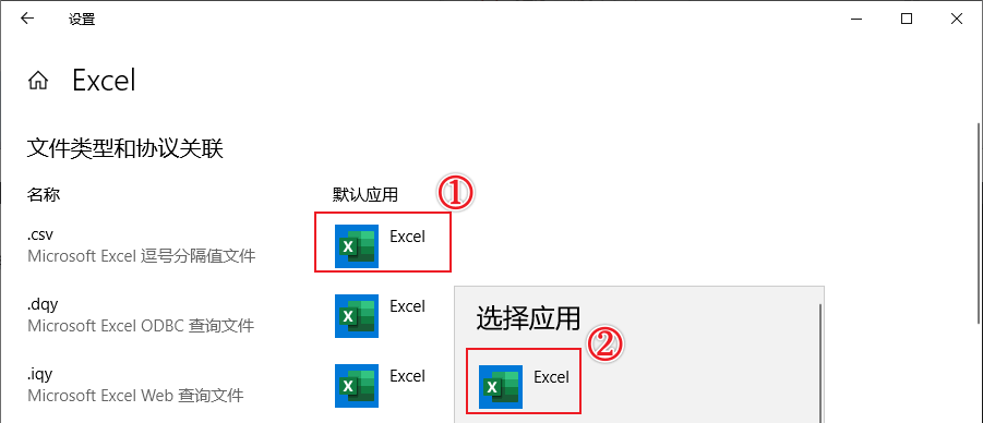 Windows 设置(快捷键:Win + I) → 应用 → 按应用设置默认值 → 输入“Excel” → (点击筛选出来的结果)。