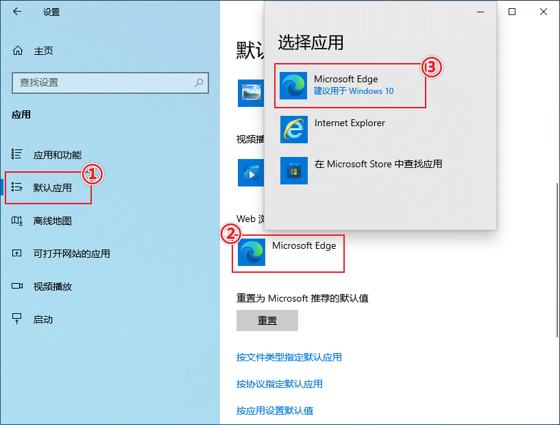 打开 Windows 设置中心(快捷键:Win + I) → 应用 → 默认应用 → Web 浏览器 → Microsoft Edge。