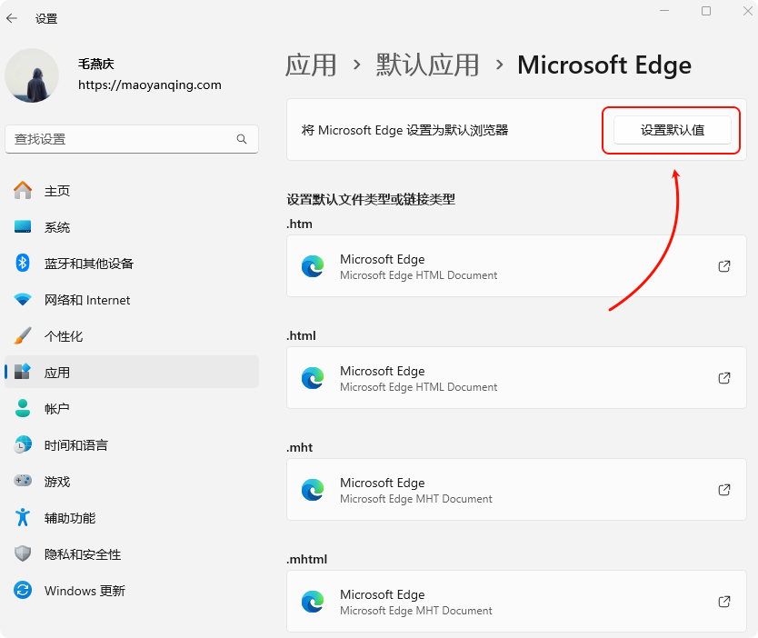 打开 Windows 设置中心(快捷键:Win + I) → 应用 → 默认应用 → 「设置应用程序的默认值」搜索「edge」 Microsoft Edge → 设置默认值。