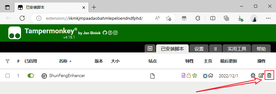 在Tampermonkey的管理面板中,定位到 ShunFengEnhancer → 在屏幕的最右侧,点击 删除