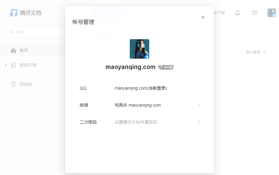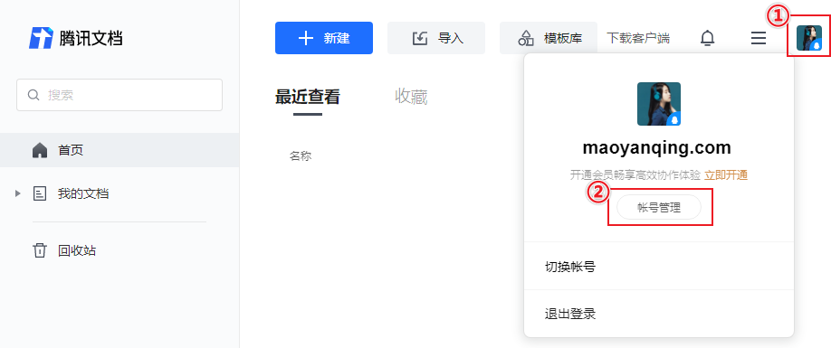 打开 腾讯文档官网 → 点击右上角的头像 → 点击 账号管理 按钮