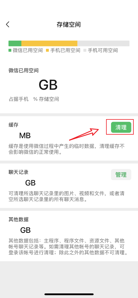 解决办法:手机微信 → 我 → 设置 → 通用 → 存储空间 → 缓存 → 清理。