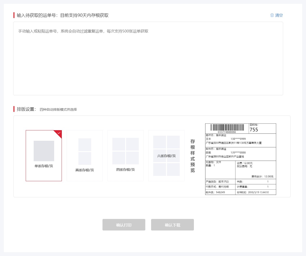 手动输入或粘贴运单号 → 选择“单张存根/页” → 确认下载。