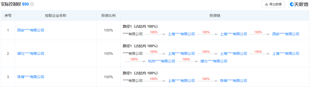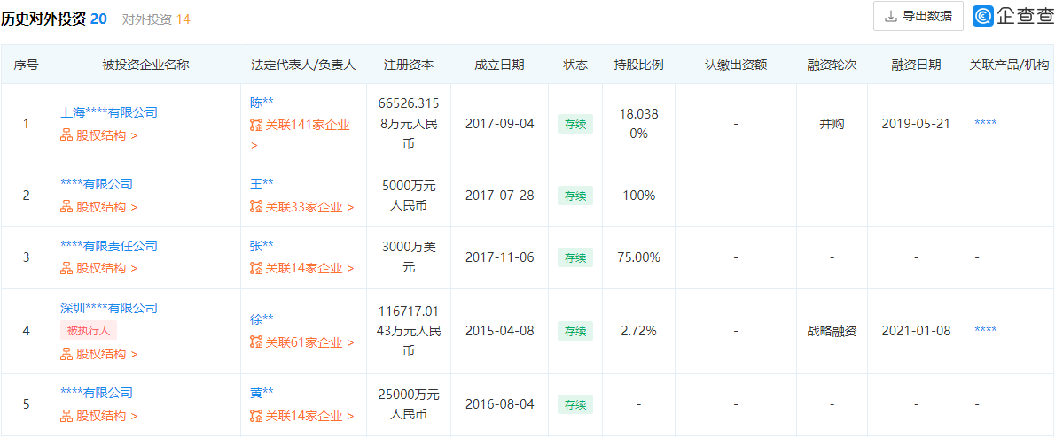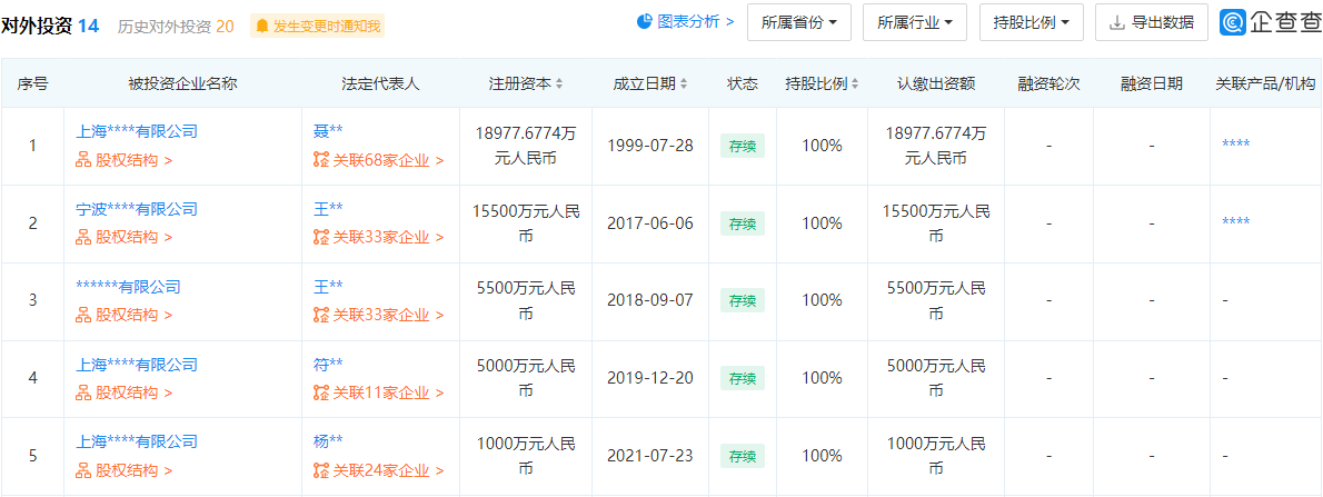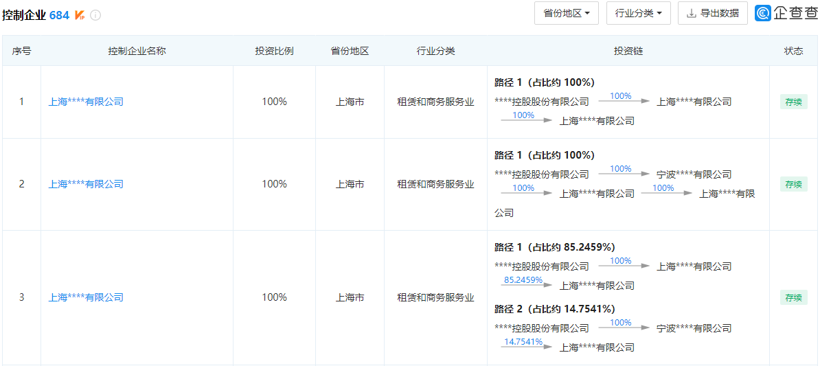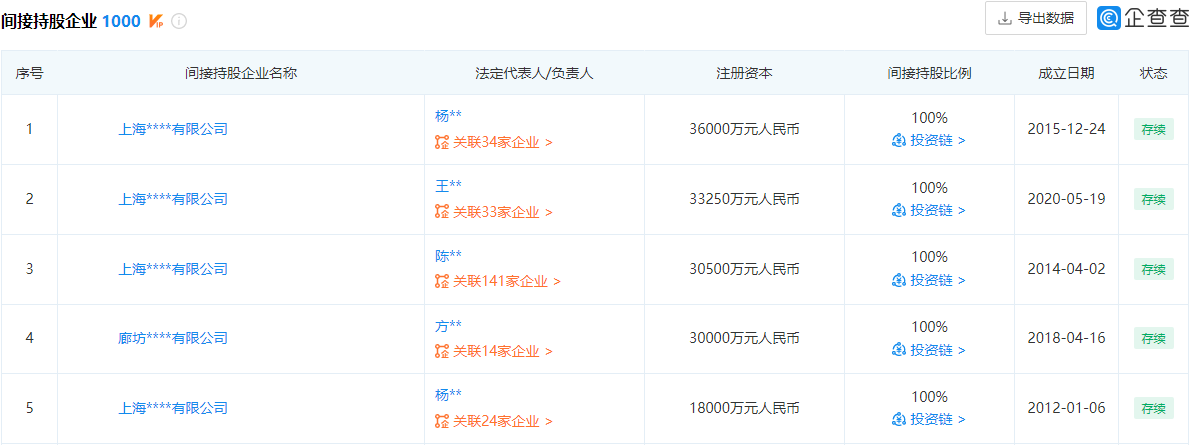 在第三方工商信息查询系统中,使用被审计单位的公司名称查询并导出其对外投资、历史对外投资、控制企业、间接持股企业等信息。