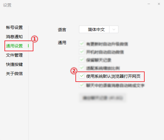【微信】使用系统默认浏览器打开网页 2023-3-29 21:04 | 5,173 | 0 | 软件教程 116 字 | 1 分钟内 1. 打开设置 登录PC版“微信”,点击左下角的 ≡ 按钮 ,然后点击 设置 按钮。 2. 设置“使用系统默认浏览器打开网页” 点击 通用设置 → 勾选“使用系统默认浏览器打开网页”。 3. 设置默认浏览器 将自己常用的浏览器设置为默认浏览器,可以参考:点击查看 赞赏