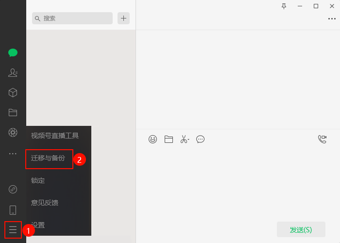 登录 Windows 版“微信” → 点击左下角的 ≡ 按钮 → 点击 迁移与备份 按钮。