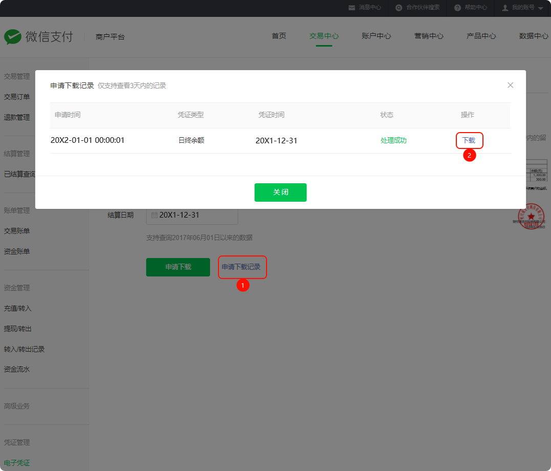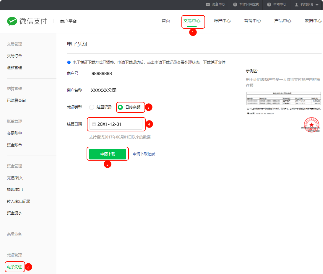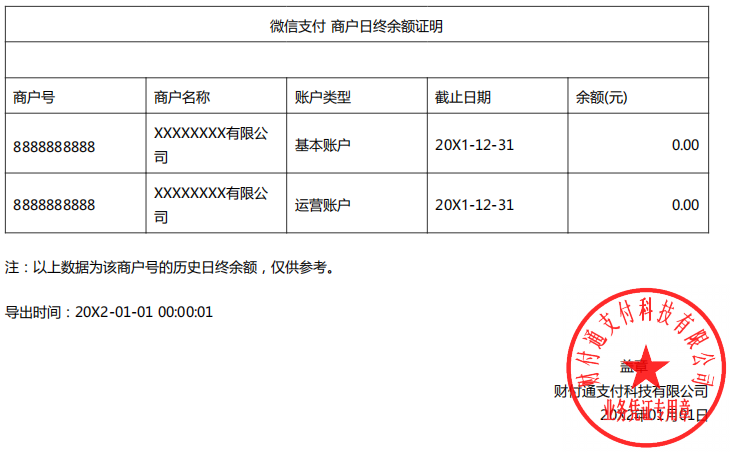 微信支付-商户平台 → 交易中心 → 电子凭证 → 选择“日终余额” → 选择“结算日期”(即函证基准日,如:20X1-12-31) → 申请下载。