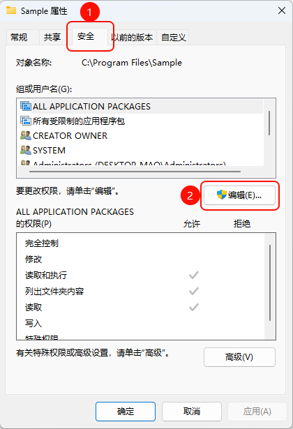 找到拟设置完全控制权限的文件夹(如: C:\Program Files\Sample ),右键点击它,选择“属性”。
