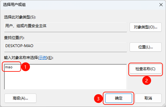 - 步骤1:在“输入对象名称来选择”的空白框中,输入在第一步中获取的用户名(此处示例为:
