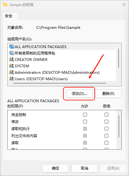在弹出的“权限”窗口中,点击 添加。