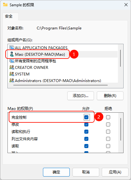- 步骤2:在下方的“权限”列表中,勾选“完全控制”对应的“允许”复选框。