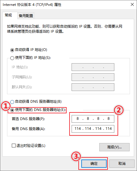 使用下面的 DNS 服务器地址 → 填写 DNS 服务器 → 确定