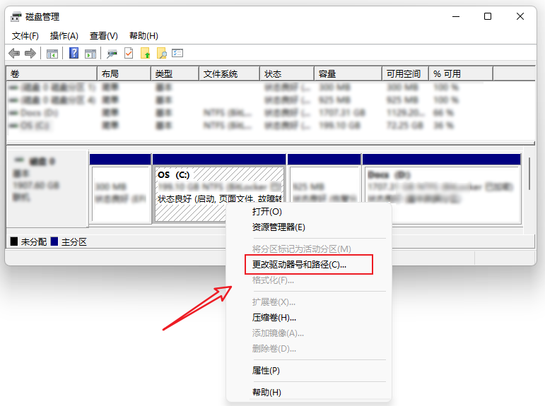 在拟修改的磁盘分区上,单击右键 → 更改驱动器号和路径