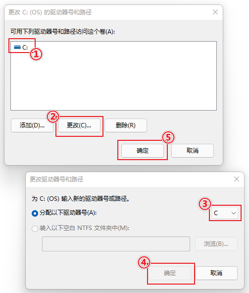 点击拟修改的驱动器号 → 更改(C)... → 下拉选择拟修改成的字母 → 确定 → 确定