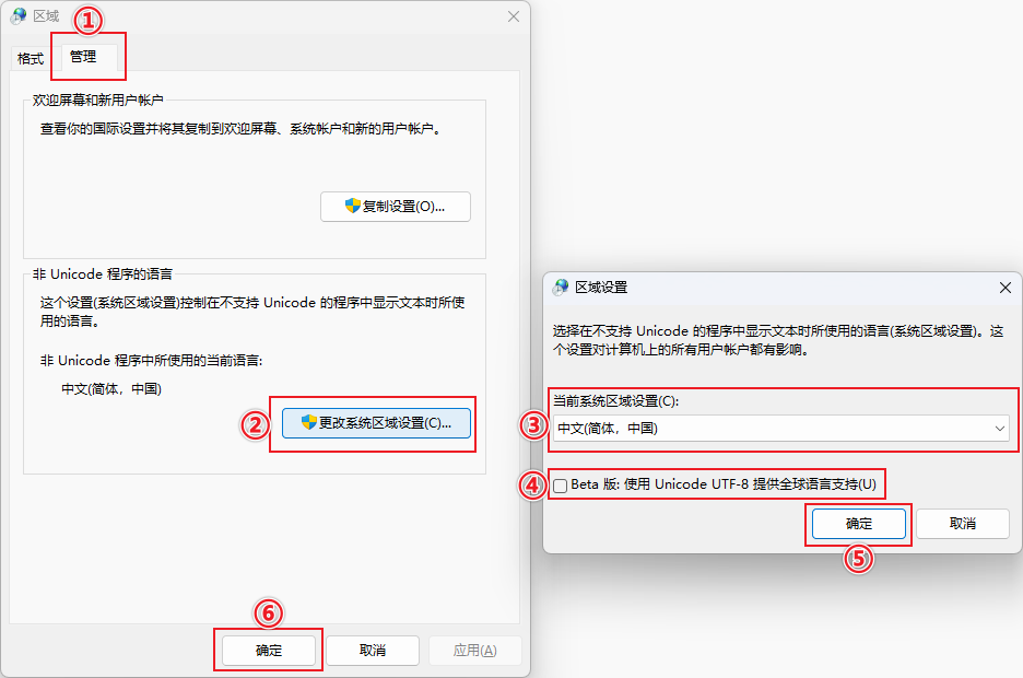 管理 → 更改系统区域设置 → 按需选择“当前系统区域设置” → 按需设置“Beta 版: 使用 Unicode UTF-8 提供全球语言支持” → 确定 → 确定。